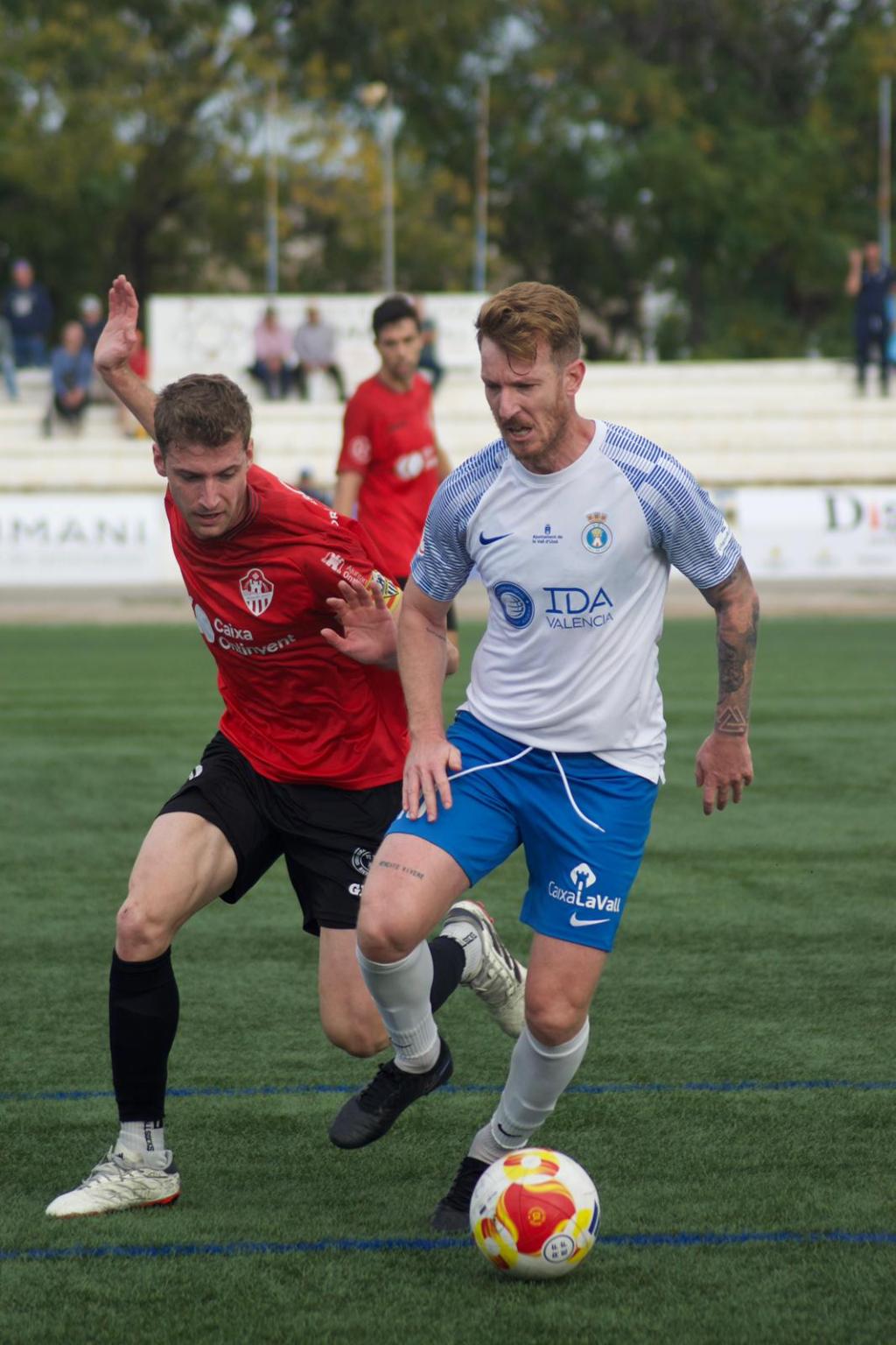 En el minuto 24 llegó la primera gran ocasión, Adrián Domínguez tras una buena asistencia de Ximo Forner se plantó solo ante el meta valenciano que aguantó bien para enviar la pelota al córner.
